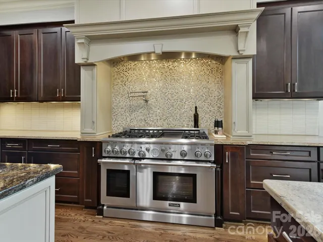Reminiscent of a romantic Italian villa, this custom brick and stone residence delivers 7000+ square feet of elegant resort-like living…in South Charlotte’s exclusive enclave of Chambery. Enjoy expansive pond views in a private park-like setting. Clark and Hall’s custom Tuscan-style iron and glass front door invites you into 3 levels of meticulously designed living spaces that include 6 bedroom en-suites, a powder room, multiple main level offices, bonus rooms, and flex rooms galore. Oversized casement windows. Arched doorways. Dramatic ceilings throughout: vaulted, tray, cathedral, coffered and turret ranging from 9.5 to 16 feet in height. Hardwood floors throughout much of the main and upper levels. Formal living room with wood wall trim. Great room with fireplace. Gourmet chef’s kitchen features two functional islands, 48” gas range, pot-filler, and built-in refrigerator. Main level oversized primary bedroom suite boasts walk-in closet with new Stark carpet, dual vanities, spa-like bathroom with linen closet, soaking tub, glass shower, heated bathroom floors and private water closet. Two large bonus rooms flank the upstairs floor plan offering 3 generously-sized bedroom en-suites and loft space. One Upstairs Bonus Room functions as a private, undiscoverable safe room and cleverly closes with a custom bookshelf door. The Basement retreat offers 2 bedroom en-suites (one currently used as a home gym), a home theater/media room with tiered seating and projection screen, a 2nd kitchen, and a 500+ bottle humidity-controlled wine cellar, and an abundance of storage. Elevated rear loggia and majestic veranda overlook a heated pool with integrated spa: the perfect backdrop for casual gatherings or formal entertaining. Outdoor grill area. 2-car garage leads to interior drop zone with cabinetry. Dedicated 1-car garage is private and offers no access to interior (currently home to a golf simulator that does not convey). Conveniently located to SouthPark, Phillips Place, championship golf courses, greenways, fine dining and Charlotte Douglas International Airport.