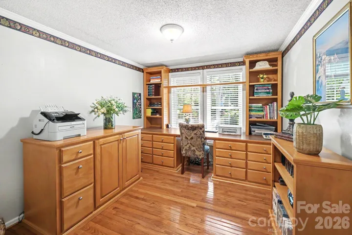 The home offers 4 bedrooms, split-bedroom layout. The 4th bedroom is currently set up as a home office with built-ins—ideal for remote work or flex space. The spacious primary suite features a large bath with walk-in shower. Wood flooring runs throughout, adding warmth and continuity to the living spaces.